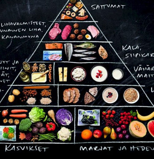 Oheisessa ruokapyramidissa on esitetty terveellinen, monipuolinen, suomalainen ravitsemussuositus – perustana kaikelle runsas ja värikäs vihannesten, kasvisten, hedelmien sekä marjojen saanti. Pyramidin yläosasta voit löytää sattumat (makeiset, makkarat, sipsit, keksit ja muut herkut), joita tulisi nauttia vain harvoin.
